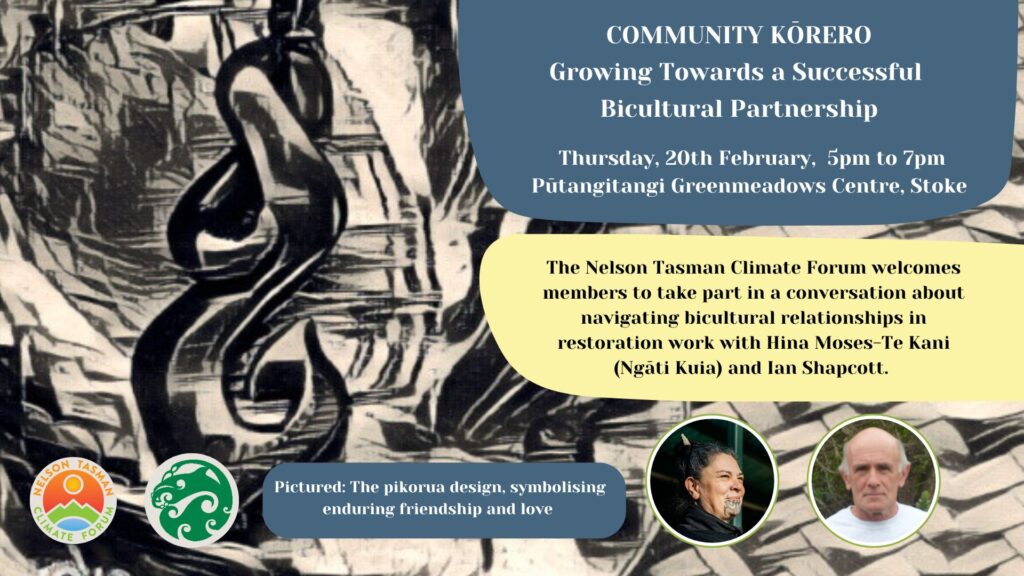 The Nelson Tasman Climate Forum welcomes you to take part in a conversation about navigating bicultural relationships in restoration work with Hina Moses-Te Kani (Ngāti Kuia) and Ian Shapcott, facilitated by Peter Lawless of Phoenix Facilitation.