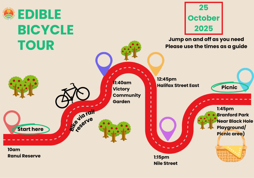 The edible bicycle tour will begin at 10am at Ranui Park with a 45-minute introduction and finish with a picnic at Branford Park at around 1pm. Stops will include Victory Community Garden, various public fruit trees and orchards and a private garden. Specific details of the tour will be sent to registrants before the event.