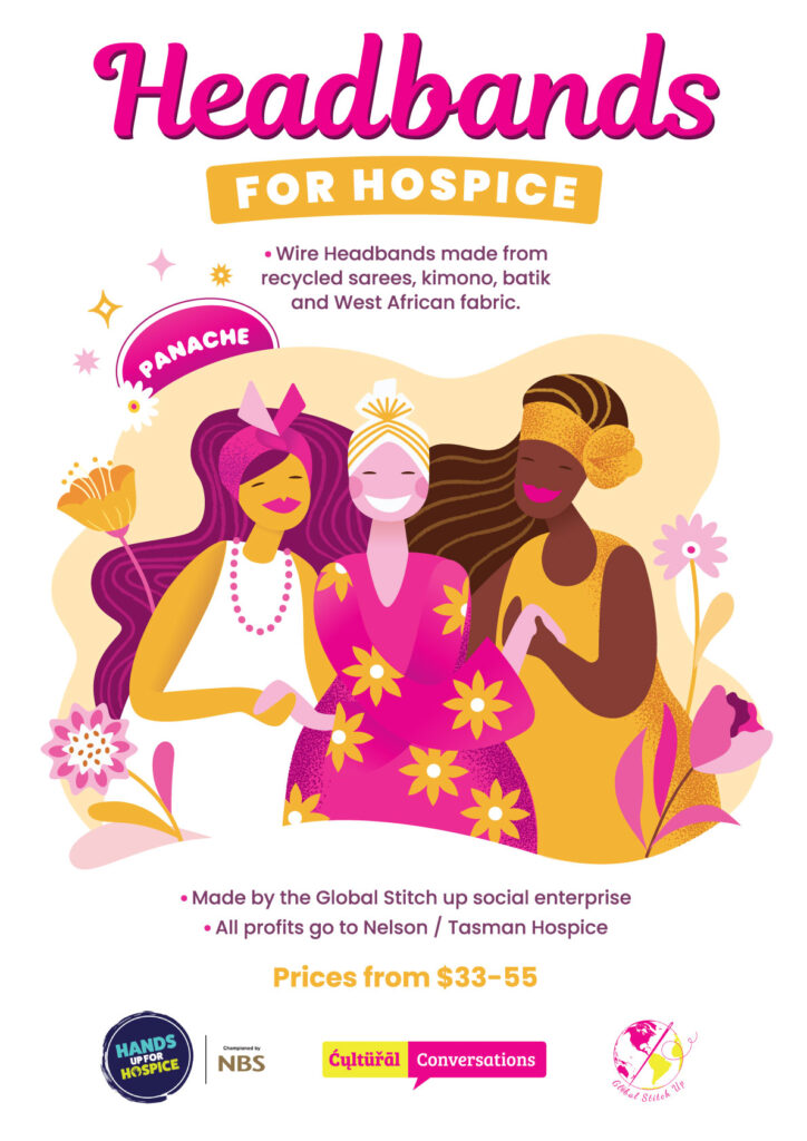 Global Stitch Up Headbands made from repurposed cultural fabrics at Hospice op-shops across Nelson and Tasma